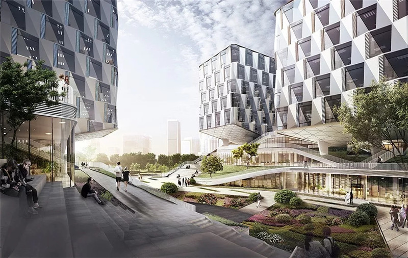 塔樓的形態(tài)力求簡潔,形成三個體塊與裙房的對比關系,具有一定的標識性。而在平面上稍作轉折變化,從視覺上消減建筑體量的壓迫感。每一幢塔樓都以左高右低的態(tài)勢首尾呼應,增強了建筑單體之間聯(lián)系,豐富了建筑天際線的變化。塔樓底部在裙房之上的局部起翹又為空間增加了多重的景深,在提供了多樣化的戶外活動與景觀空間的同時,也在視覺效果上營造了一種即將破浪躍起的動感,呈現(xiàn)活躍而又靈動的生命力。