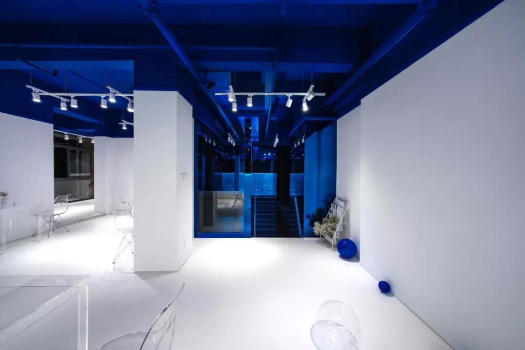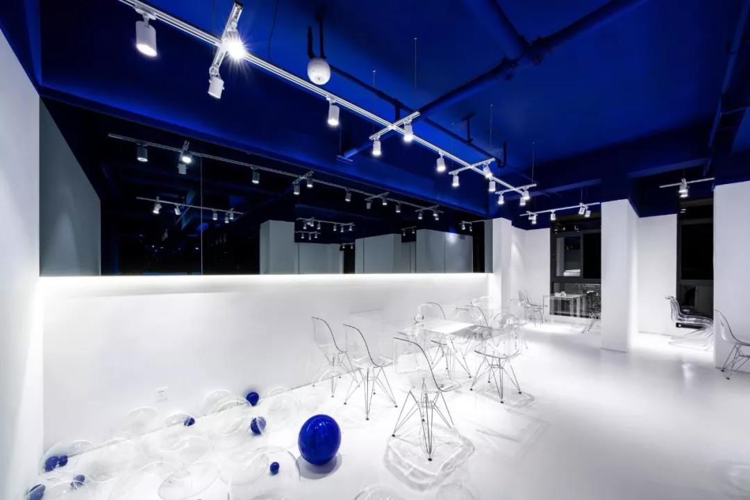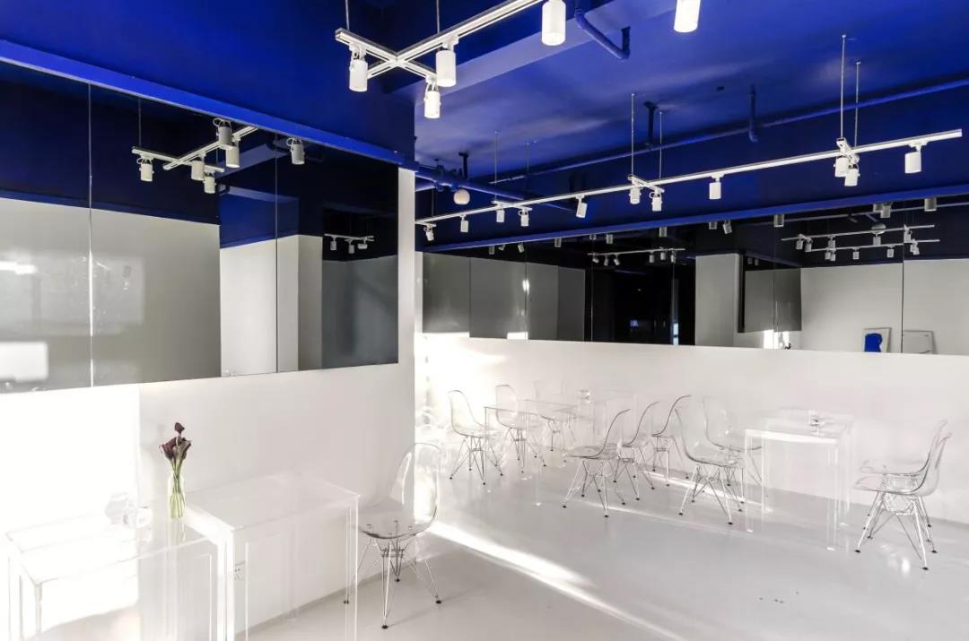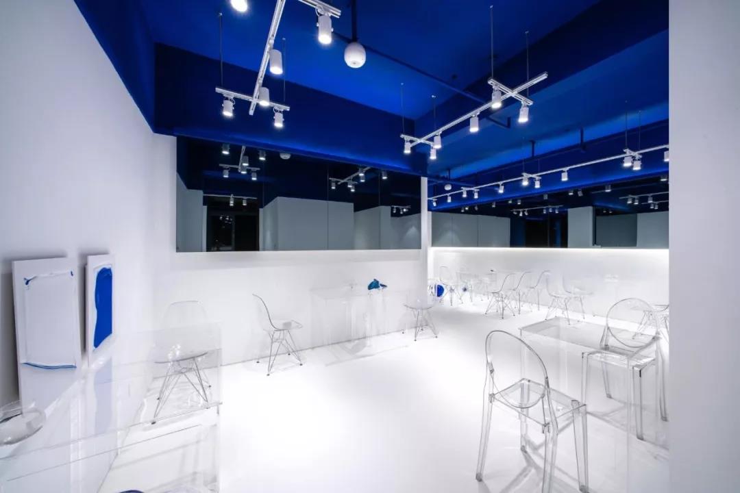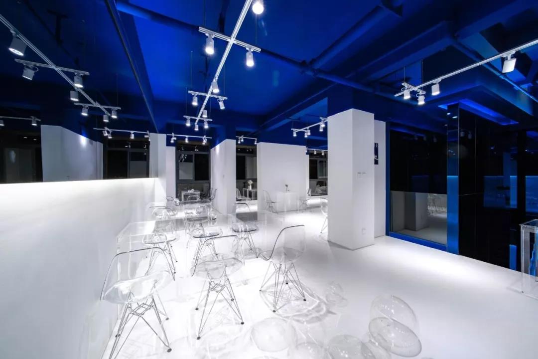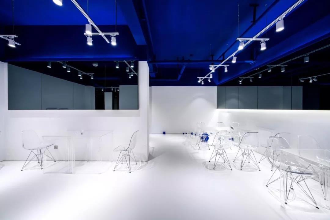 帶著這樣的邏輯,整個空間的設(shè)計就很明確了,拆除原有的吊頂,用涂料做成藍色的“天空”;下面的空間則使用帶有反射性/透明性的材料——鏡面、金屬、亞克力、塑料等,通過這種曖昧的委婉的,而非簡單粗暴的方式,讓深海的藍色充滿整個空間。