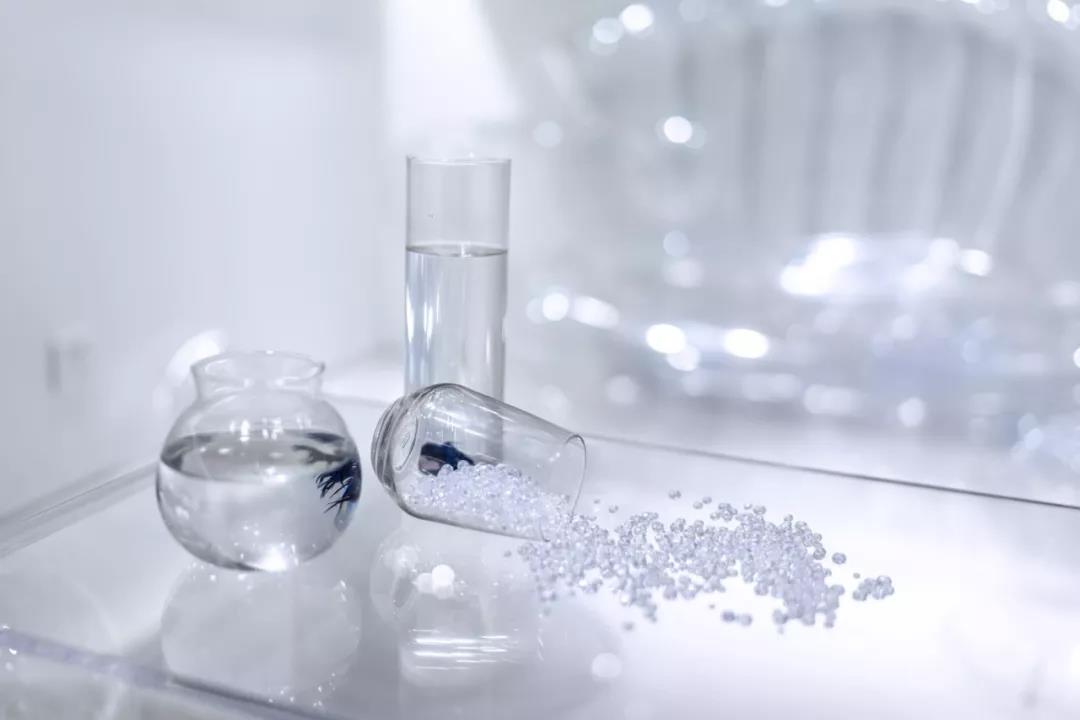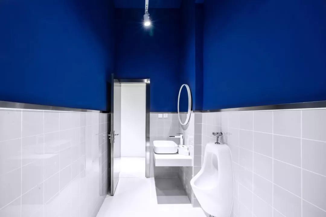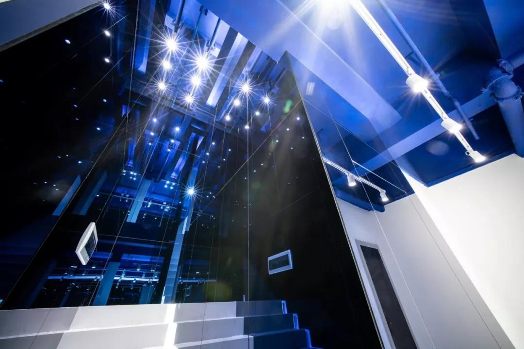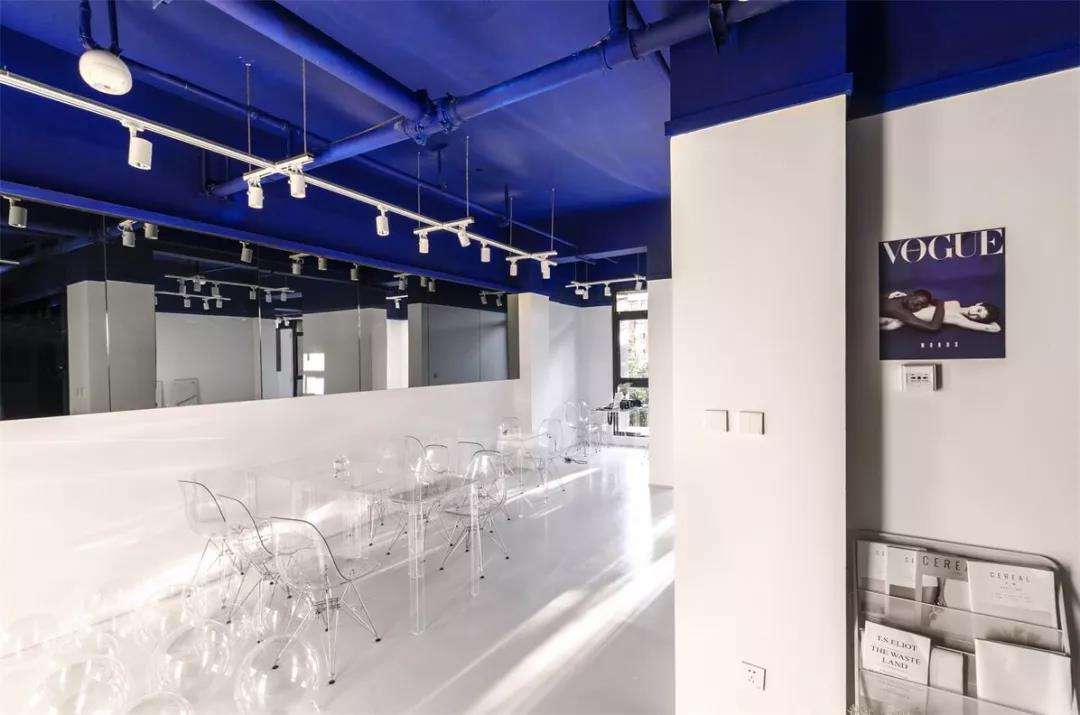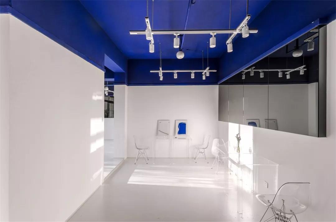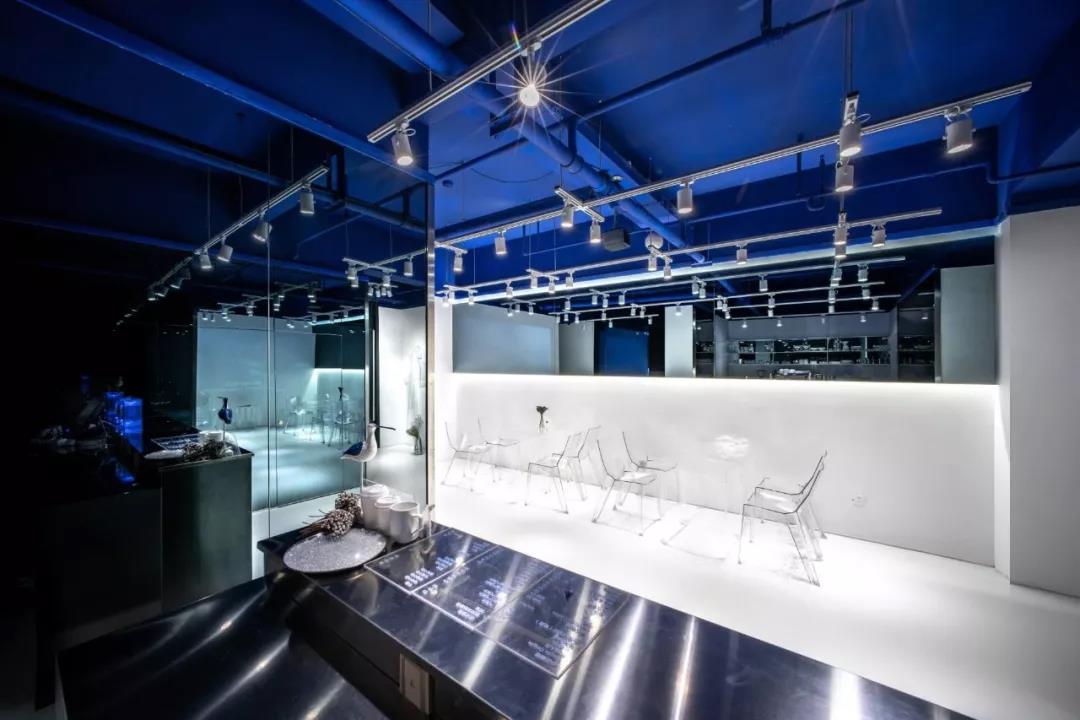 帶著這樣的邏輯,整個空間的設(shè)計就很明確了,拆除原有的吊頂,用涂料做成藍色的“天空”;下面的空間則使用帶有反射性/透明性的材料——鏡面、金屬、亞克力、塑料等,通過這種曖昧的委婉的,而非簡單粗暴的方式,讓深海的藍色充滿整個空間。