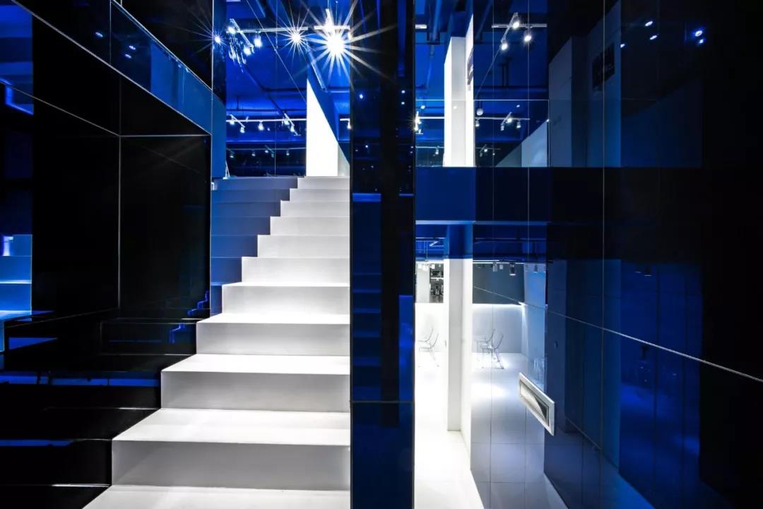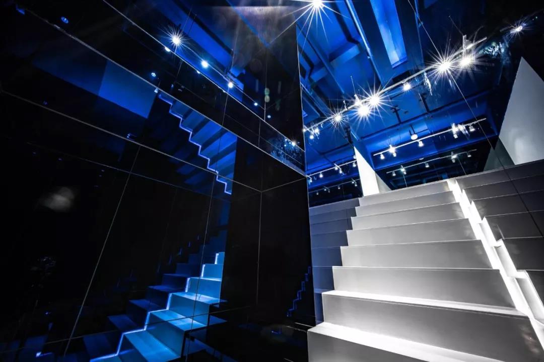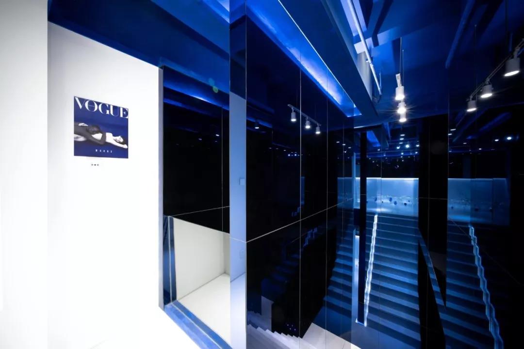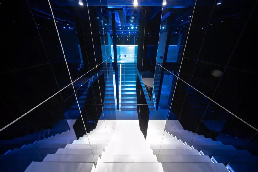 鏡面材質(zhì)方面,大面積使用的玻璃鏡面增加了空間的延伸感和開闊性,而鏡面的安裝則在通過多層板固定在墻面,并且鏡面外邊框則通過多層板開暗槽暗藏了LED燈帶創(chuàng)造出鏡面懸浮在空中的效果。設(shè)計中出現(xiàn)了普通的灰鏡以及在樓梯空間部分為了強調(diào)反射效果而采用的藍鏡,樓梯空間的大面積鏡面配合不同地方的光源、以及藍色頂面不同層次的漫反射創(chuàng)造出一種夢幻的效果。
