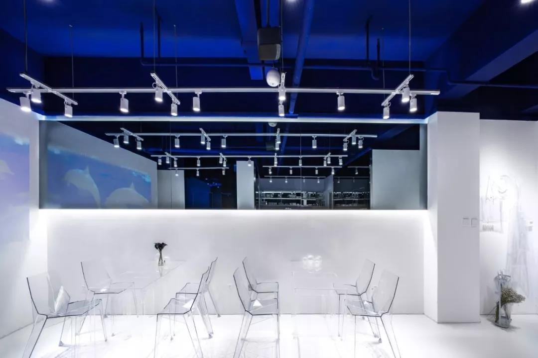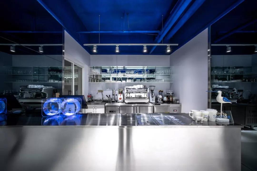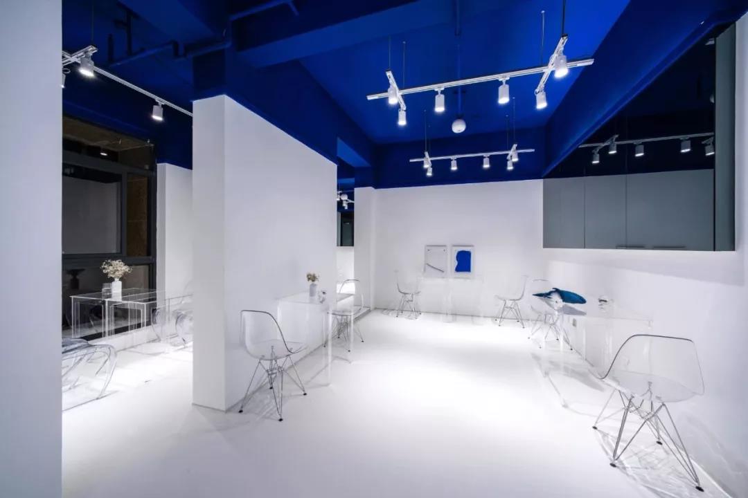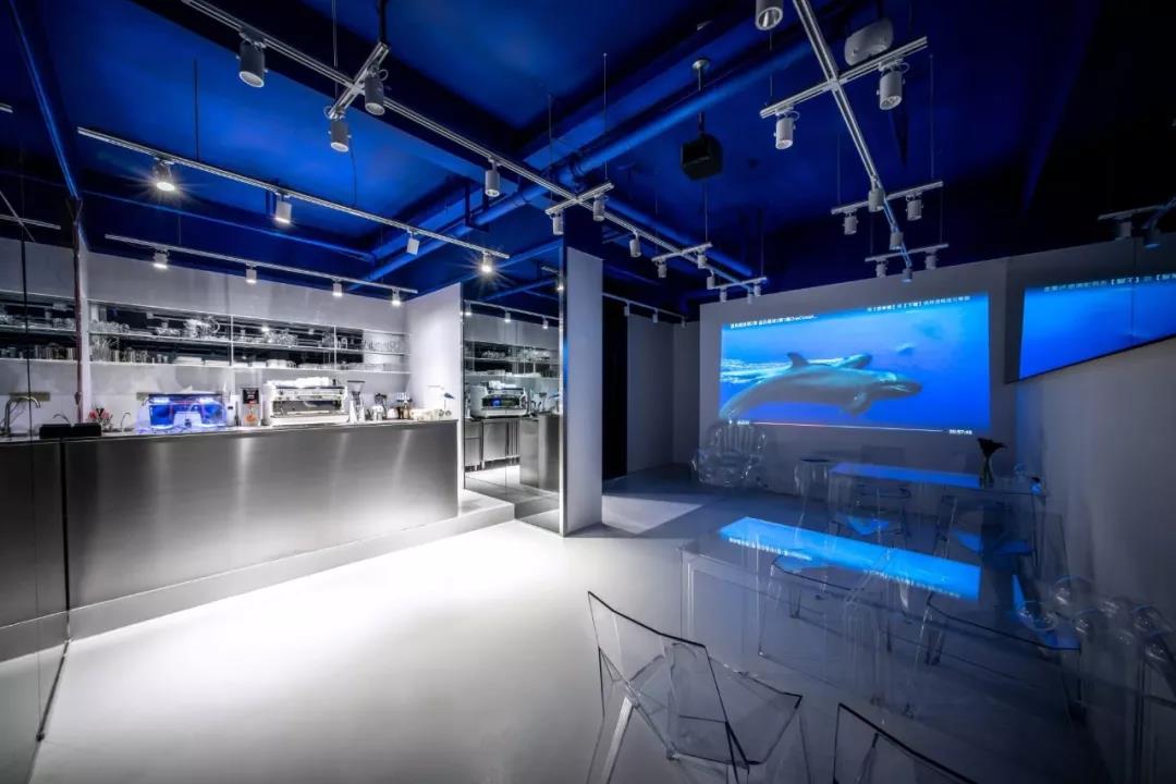 因為業(yè)主確定咖啡館名字叫“深海”,所以設(shè)計師花了心思去思考到底“深海”是什么。不同于常規(guī)的思考和正常做設(shè)計時搜索參考圖片的是,往往這樣的設(shè)計都是帶有藍色的空間,但“深海”這個名稱所帶來的概念思考卻是,為什么深海是藍色的?當(dāng)透過這層思考方式去搜索就會發(fā)現(xiàn),海水之所以是藍色,是因為天空是藍色的(原理就不多說了),水體(空間)是透明的,所以深海的藍色是光和材料本身所產(chǎn)生的而非通過“設(shè)計”創(chuàng)造的。