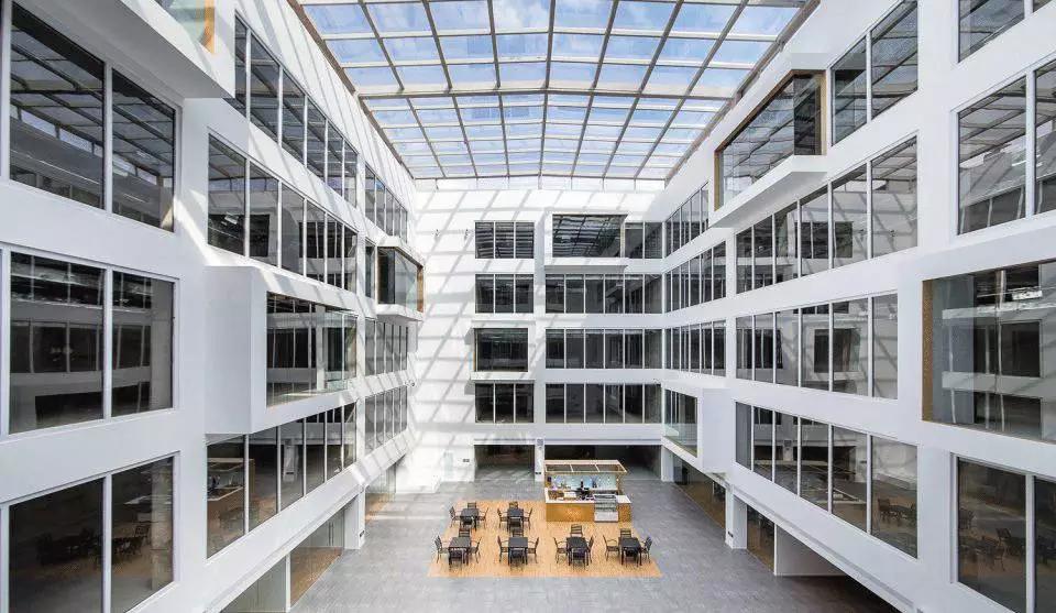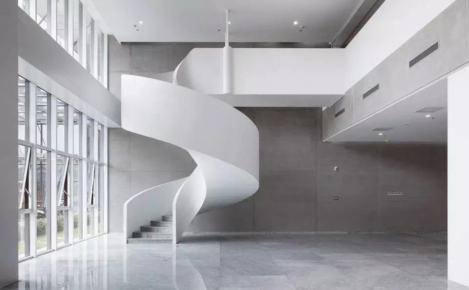 從中庭的自然光到室內(nèi)的人工光,大廈的光影在豁然開朗和細(xì)致入微之中不斷變換。中庭必須和天空有所交流,尤其是霧霾肆虐的今天,藍(lán)天顯得特別稀有,在中庭上方加蓋玻璃幕墻為上策。流空素影正翩翻,使得存在于強(qiáng)烈靜態(tài)空間體驗(yàn)中的人又能同時(shí)感受到光影與云卷云舒的動(dòng)態(tài)變化。在典型的辦公樓層,小型私人會(huì)議室從中庭立面懸挑而出,并錯(cuò)落有致,打破了中庭的單調(diào),并增加了最小辦公空間的面積。一側(cè)的螺旋樓梯飄逸靈動(dòng),用混凝土演繹出的獨(dú)特輕薄感如風(fēng)裳皎立,引辦公的人們靈感興發(fā)。
