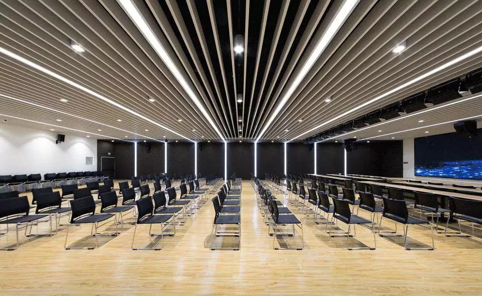 不同的空間內(nèi)容對(duì)應(yīng)不同的材質(zhì)氛圍,從色彩到質(zhì)感,再到意象化的裝飾,我們依據(jù)大堂、會(huì)議、休息室、中庭等不同空間尺度與空間內(nèi)容營(yíng)造新穎豐富、恰如其分的空間氛圍。溫暖的木色、混凝土板、白色大理石和白色乳膠漆為主要材料,其中報(bào)告廳大異其趣,優(yōu)雅高貴的深灰色布藝軟包與報(bào)告廳的相對(duì)集中和封閉性相得益彰。我們依托原有建筑空間序列,如大堂-電梯廳-等候區(qū)-多功能廳-VIP室-展廳,調(diào)整改變室內(nèi)設(shè)計(jì)的溫度與濃度,為原本純功能理性化的空間組織蒙上一層魅力面紗,讓功能化的“經(jīng)過(guò)”變?yōu)橐淮尾簧岬鸟v留與感受。