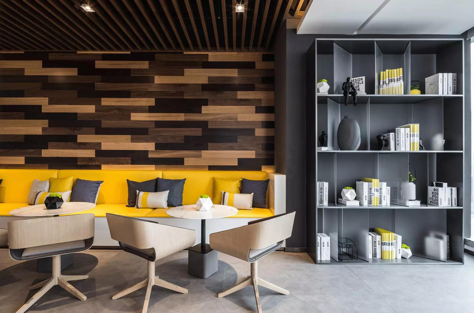 設(shè)計(jì)師用藍(lán)與灰搭配出冷靜主色調(diào),綴以沙發(fā)的暖意來(lái)提亮空間,而背景以深淺原木交錯(cuò)搭配,設(shè)計(jì)流于細(xì)節(jié)之中。閑時(shí),或仰臥在沙發(fā)上、在其旁邊的書柜看一會(huì)兒閑書,或坐在沙發(fā)上與同事聊聊天、聽一段舒緩的音樂、下一盤棋,小憩之后再投入工作,想必效率也會(huì)更高。