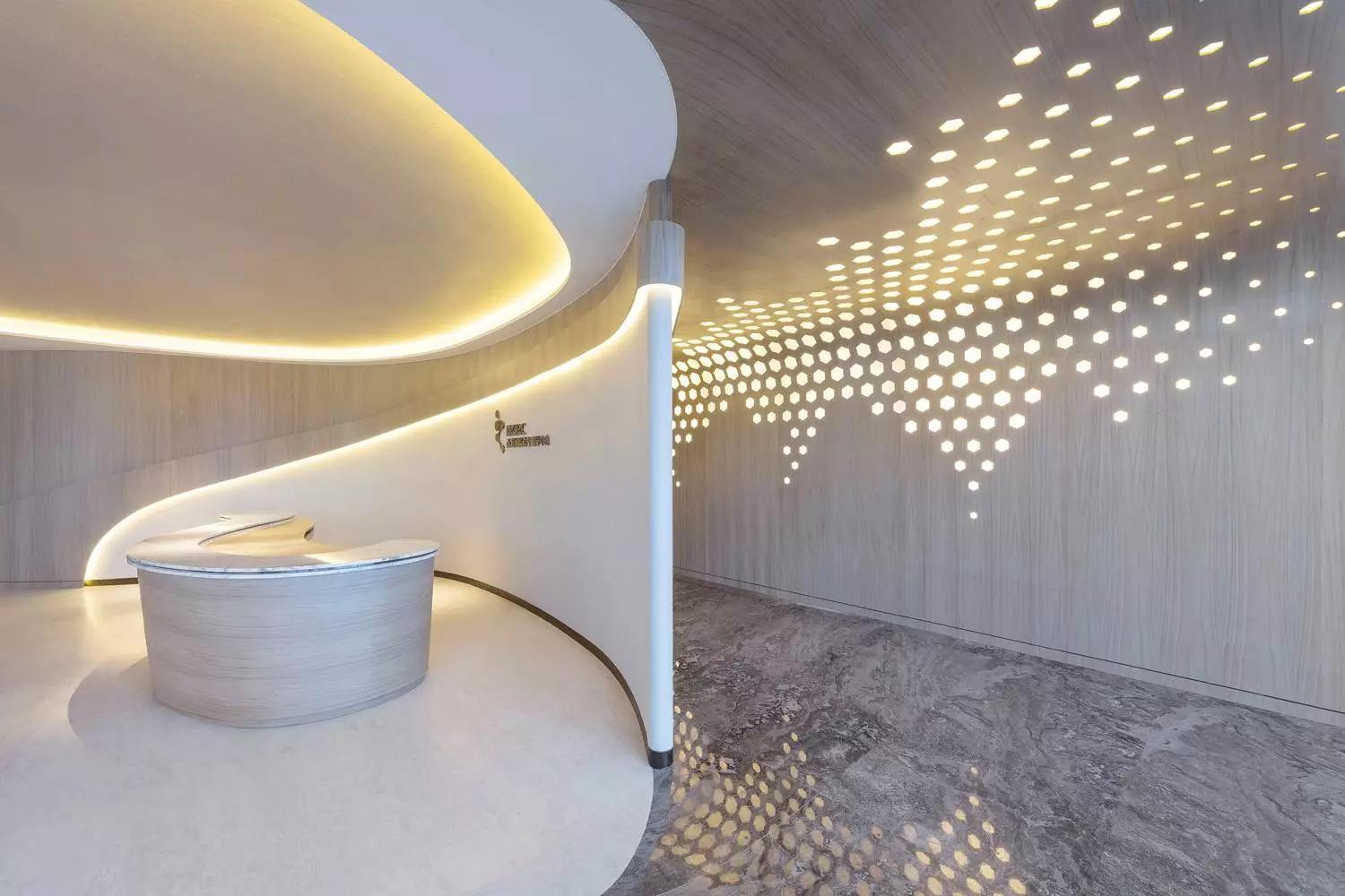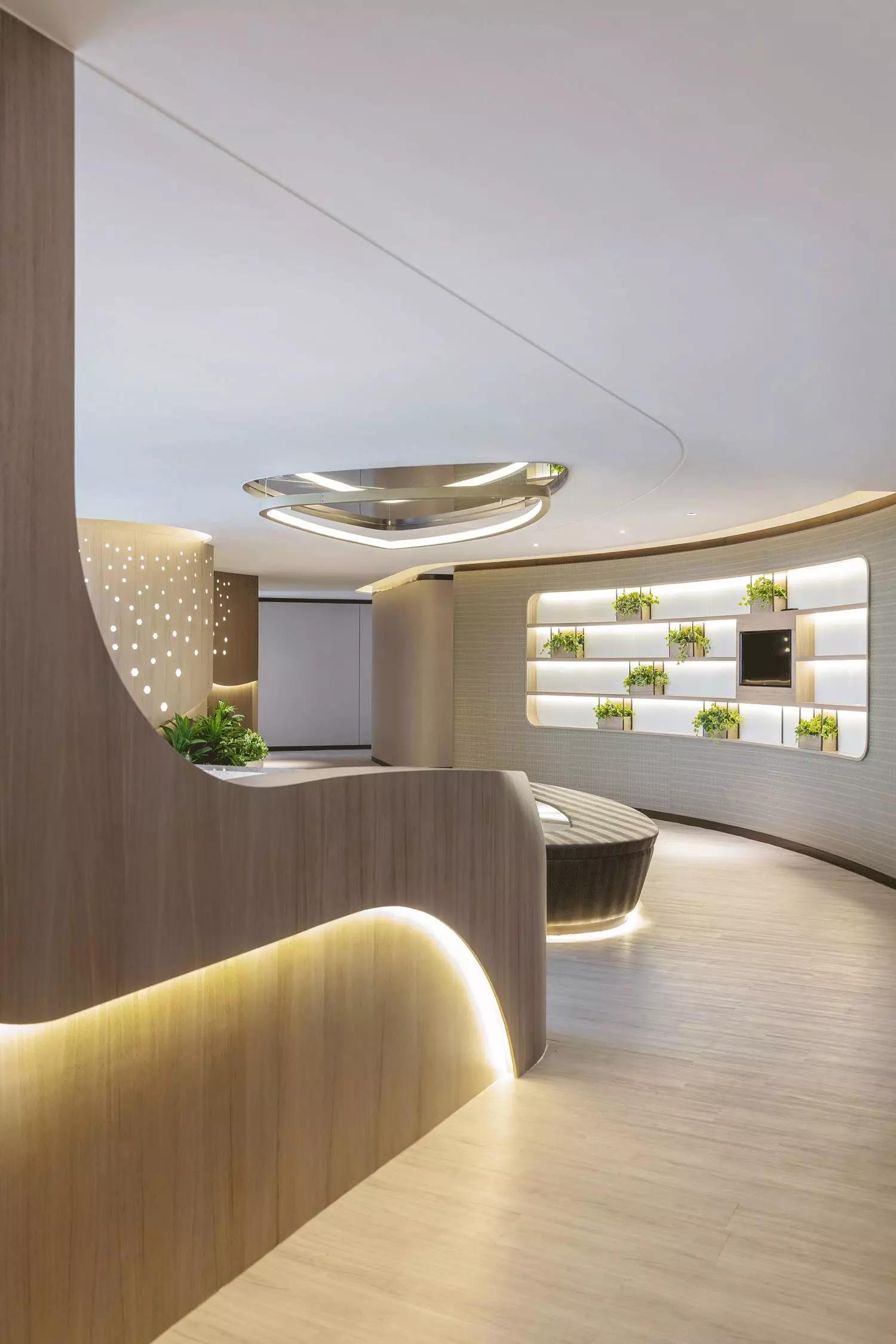 這一切該歸功于大自然的靈感,醫(yī)療中心的正門萃取最純然的木材,配合溫暖的燈光分布,隨著流線形的空間引導訪客步進全開放的接待處。